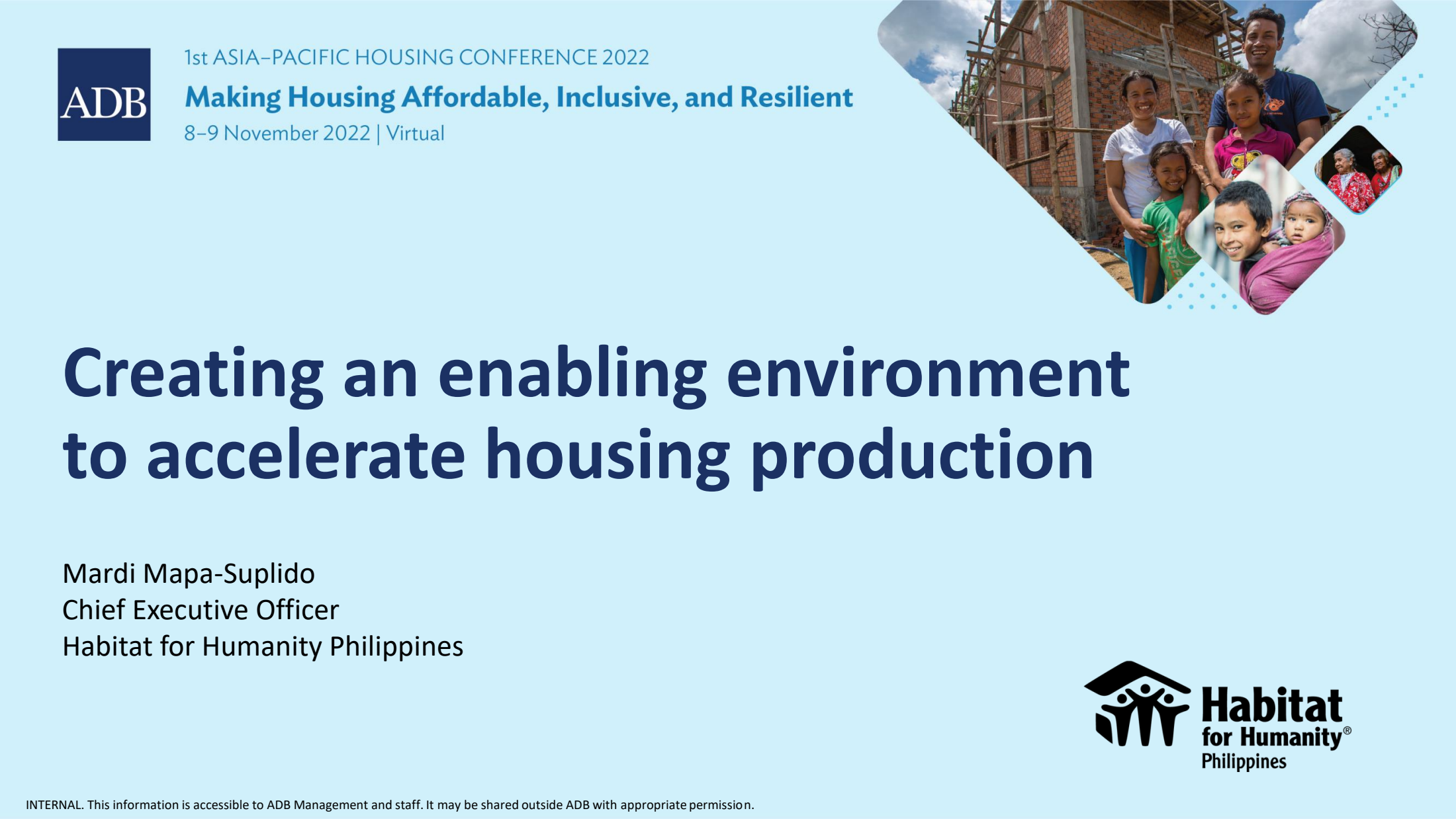 | Creating an Enabling Environment to Accelerate Housing Production Mardi Mapa-Suplid CEO, Habitat for Humanity, Philippines |
