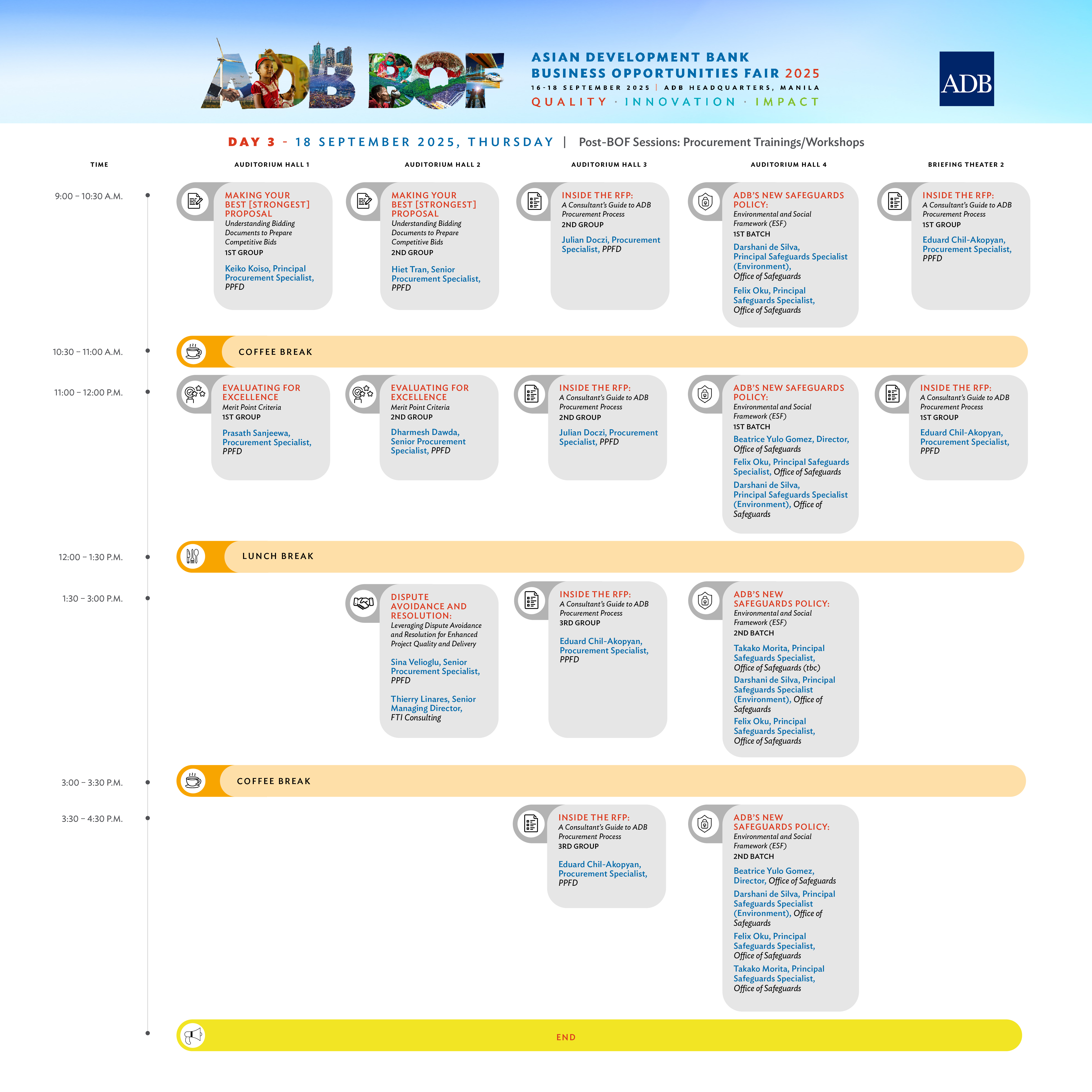 ADB procurement and sector specialists will present the general requirements for doing business with ADB, including applicable policies and procedures for the procurement of goods, works, and services, as well as ongoing and upcoming business opportunities. Additionally, specialists on ADB’s engagement with NGOs and civil society organizations will lead a dedicated session highlighting business opportunities tailored for these groups.