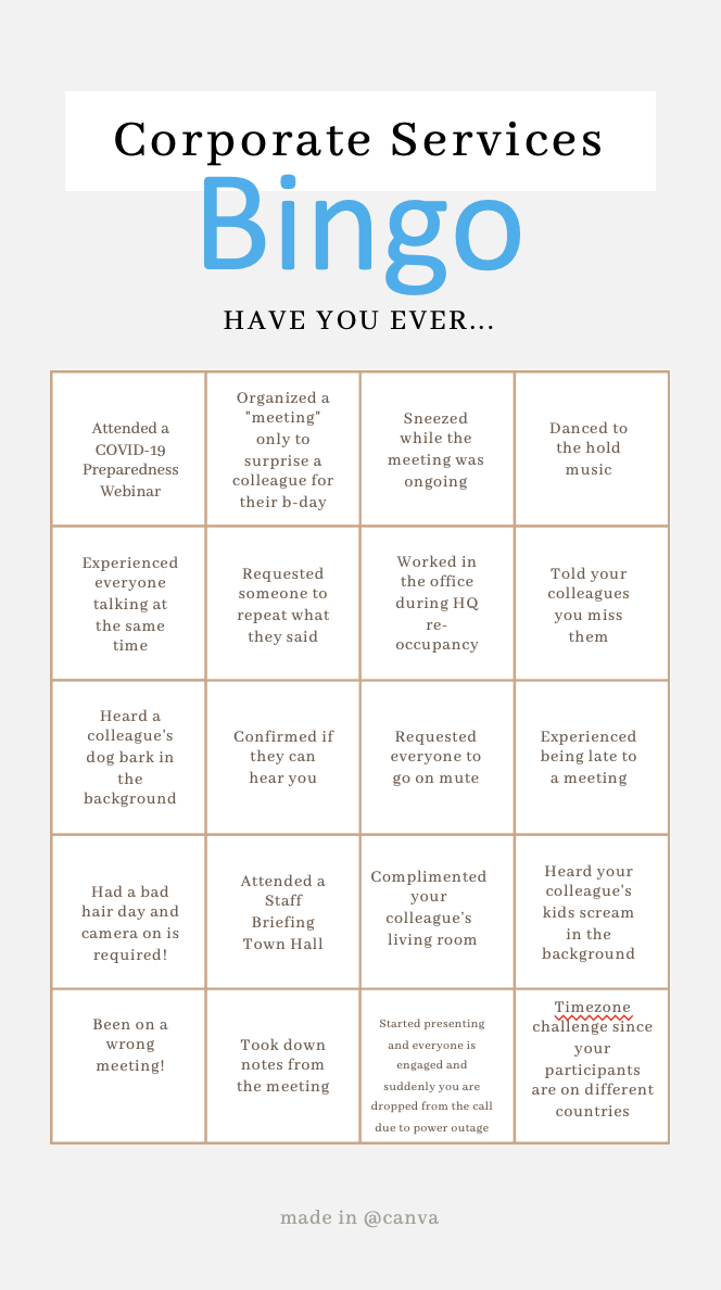 On-line Bingo 1. Download the Bingo Card 2. Mark the boxes applicable / relatable to you 3. Submit to snogueras@adb.org or anncruz@adb.org 4. The Team will pick the following winners: 1 blackout, 1 diagonal, 1 horizontal, and 1 vertical per week. | |