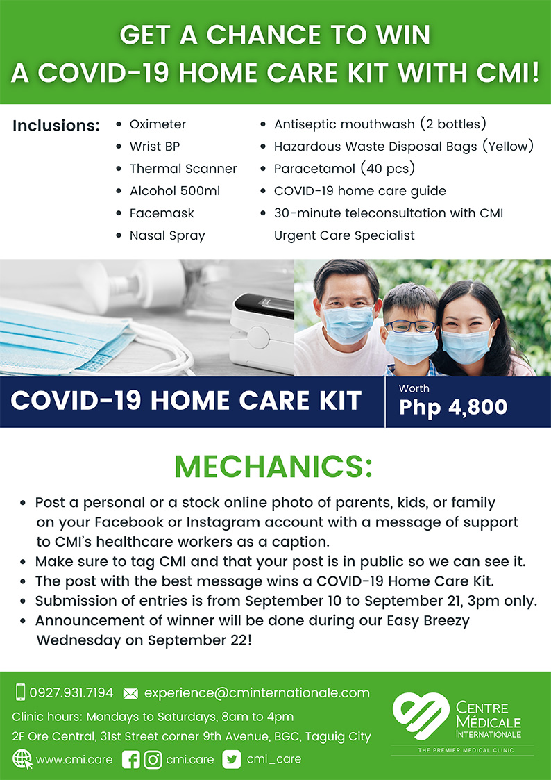 Chill O’Clock Friday September 10, 2021 (Friday) | 12nn to 1pm Event brief: Take a breather from your busy schedule and enjoy your Friday lunch break with CMI. Get a chance to win awesome prizes when you play CMI’s fun games plus! Let us take you back to the 80s with intermission numbers from a well talented singer and CMI doctor. Click the link to register and see you there! Easy Breezy Wednesday Event brief: Is it Friday yet? Celebrate small wins this midweek by grooving to the 90s with CMI! Prizes and fun await you so click on the registration link and see you there! Get a chance to win a COVID-19 Home Care Kit worth P4,800 from CMI! Deadline: 21 Sept 2021 |